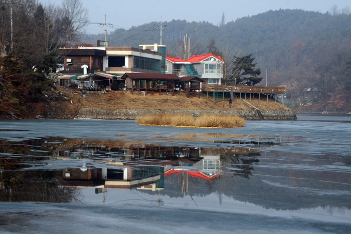 저수지의 얼음조각 사이로 보이는 반영이 참 예뻐서요.