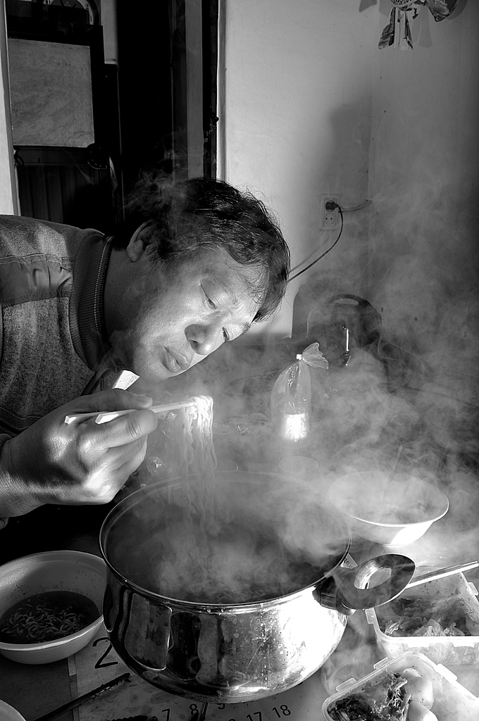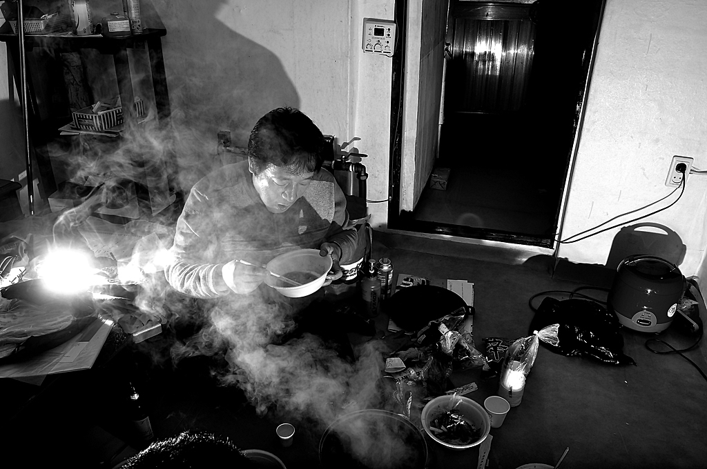 한겨울에 난방도 끈기고 라면 한그릇에 끼니를 떼운다.
