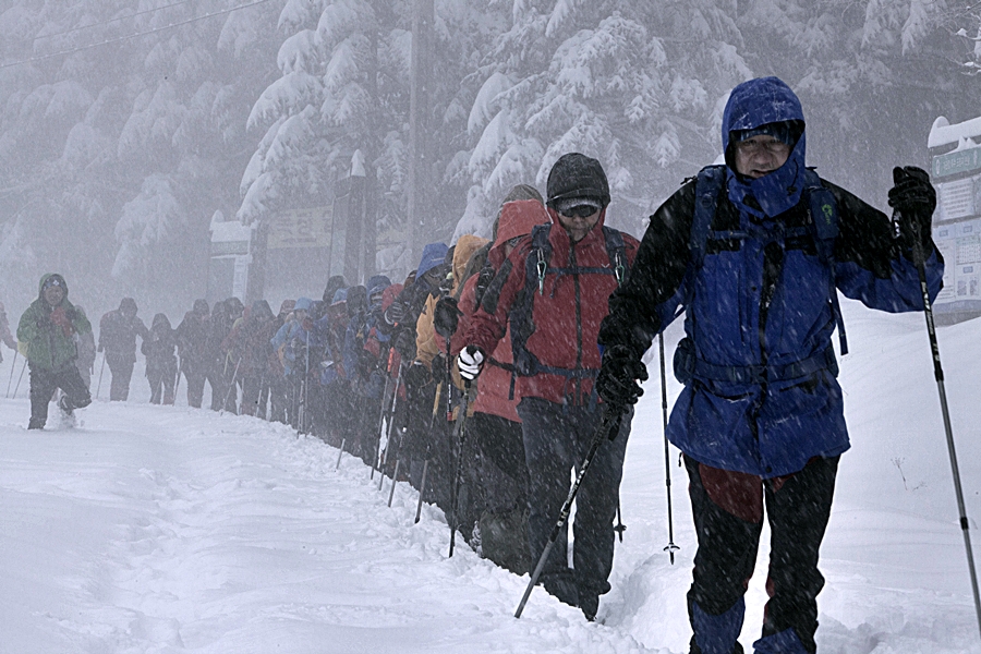 싸인 눈도 오는 눈도 두려움 없이 산행하는 행렬에
