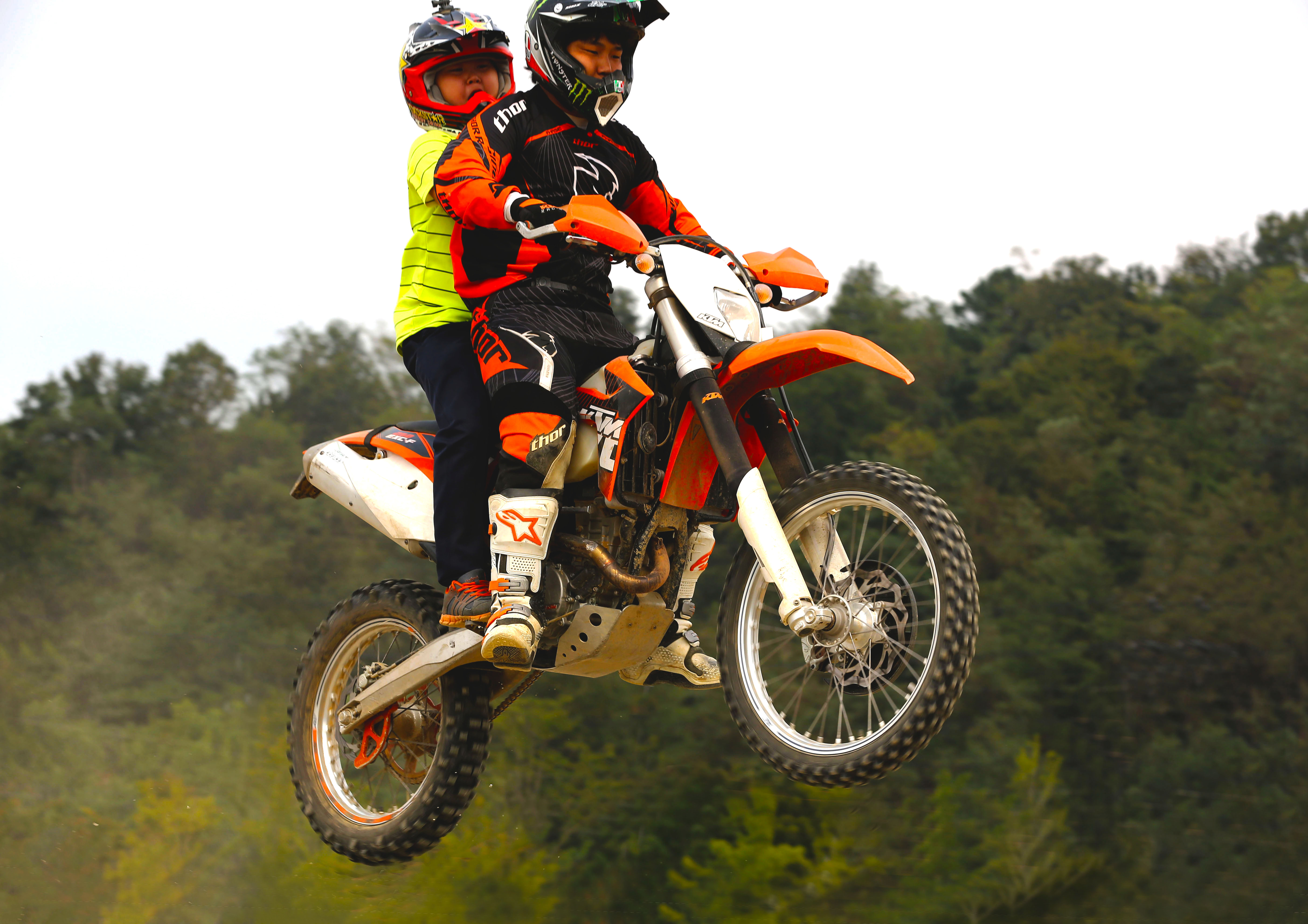 아빠와 아들이 오토바이 묘기를 하고있읍니다