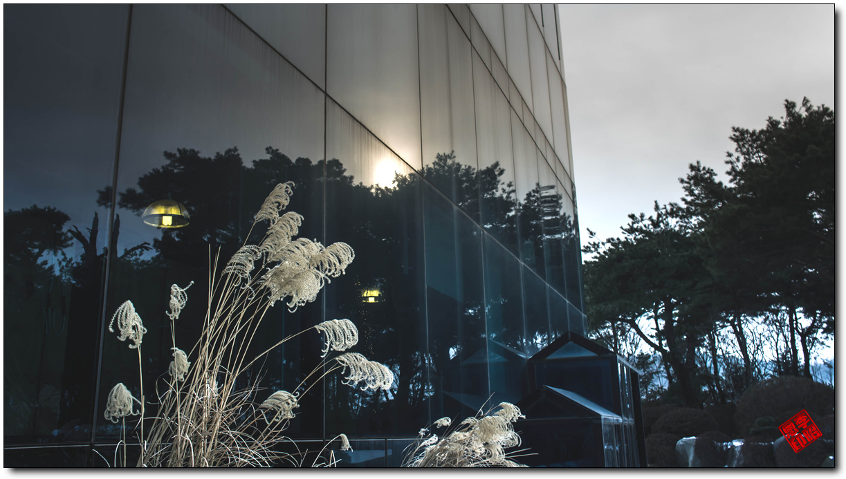 유리 건물엔 전등불빛이 있구요 나무들이 건물 유리에 반영되있어서 해와,억새도 넣어,담았습니다.