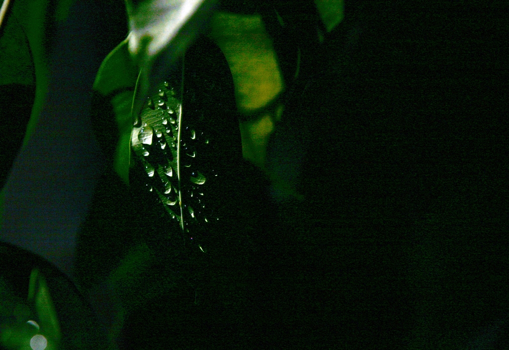 잎이 사워후 맺힌 물방울에 햇빛에 반짝인다