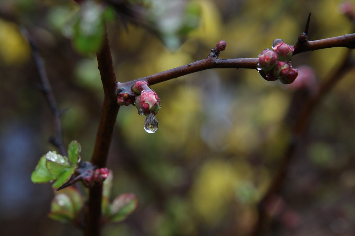 빗속의 명자꽃망울_ 꽃말은 "평범 , 정갈함"