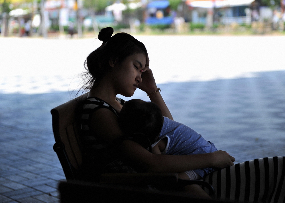 애기도 엄마도 더위에 지쳤습니다