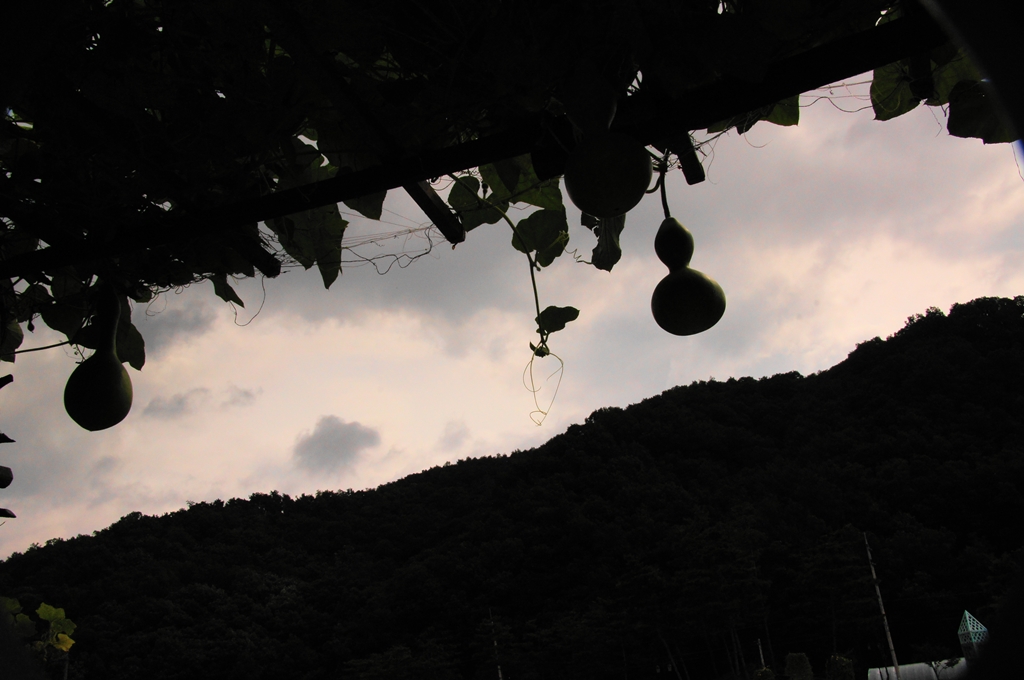 삼복 찜통 더위에 조롱박은 영글어 가는데 곧 소나기가 쏟아질 듯 싶다.