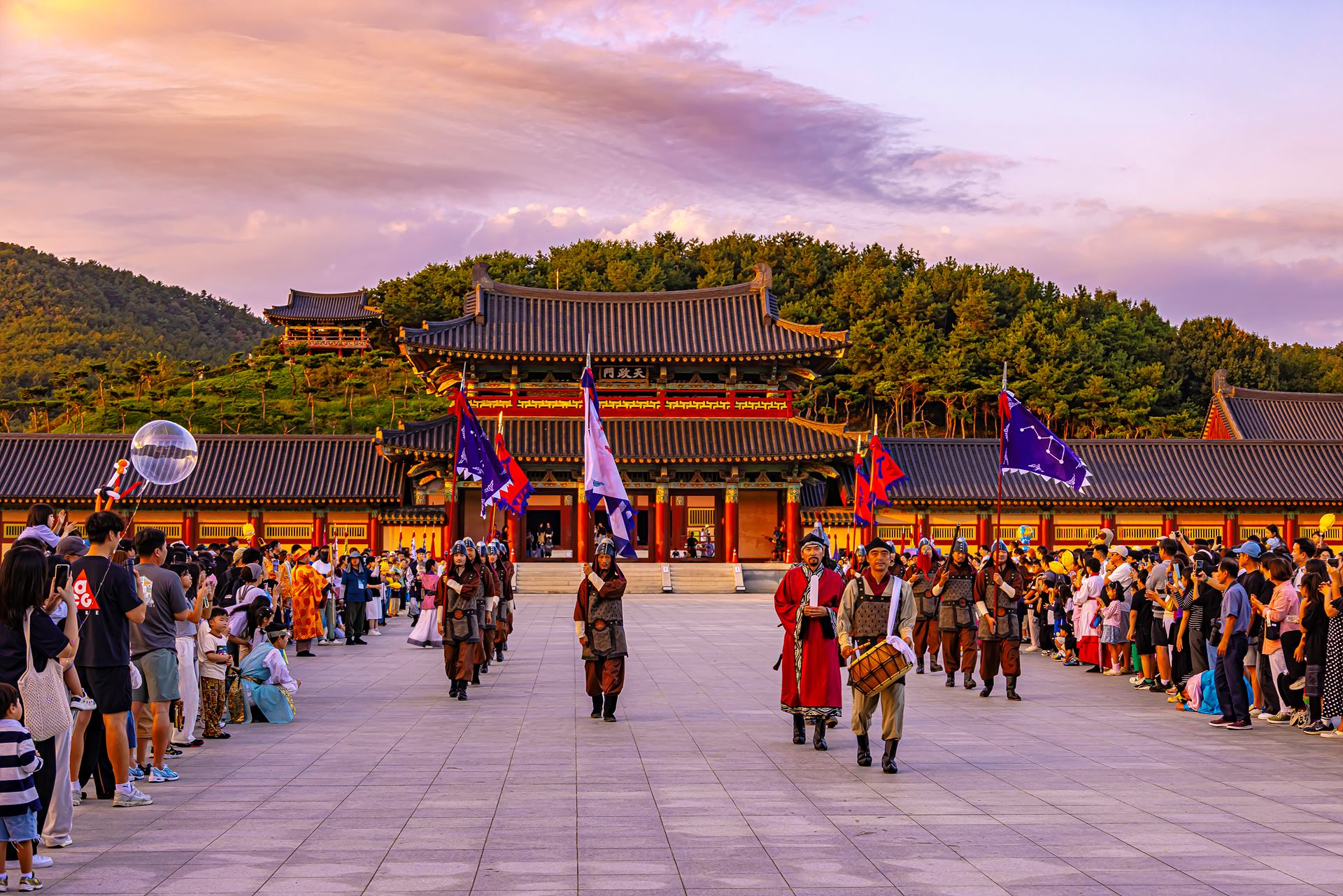 백제 왕궁에서 수문장 교대식을 하고 있다.