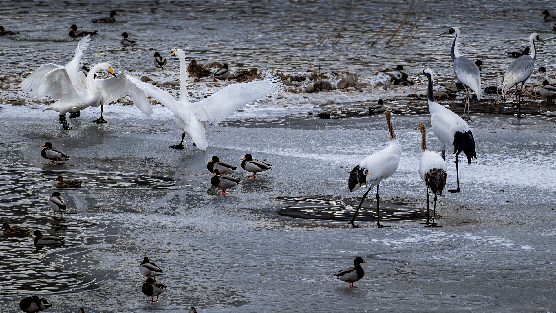 두루미(학)와 큰고니(백조),