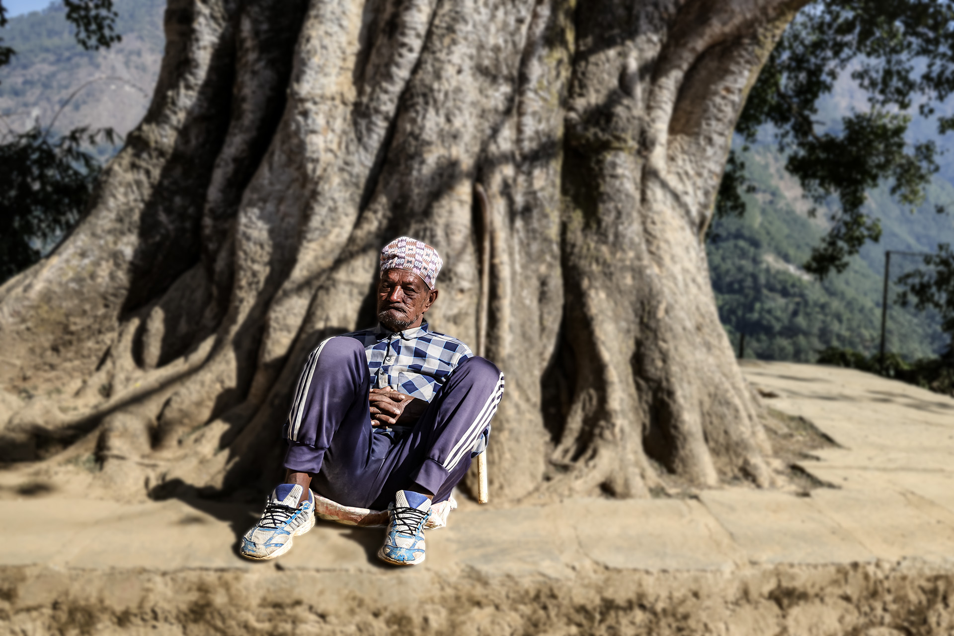 나무아레서 휴식을 취하고 있는 노인
