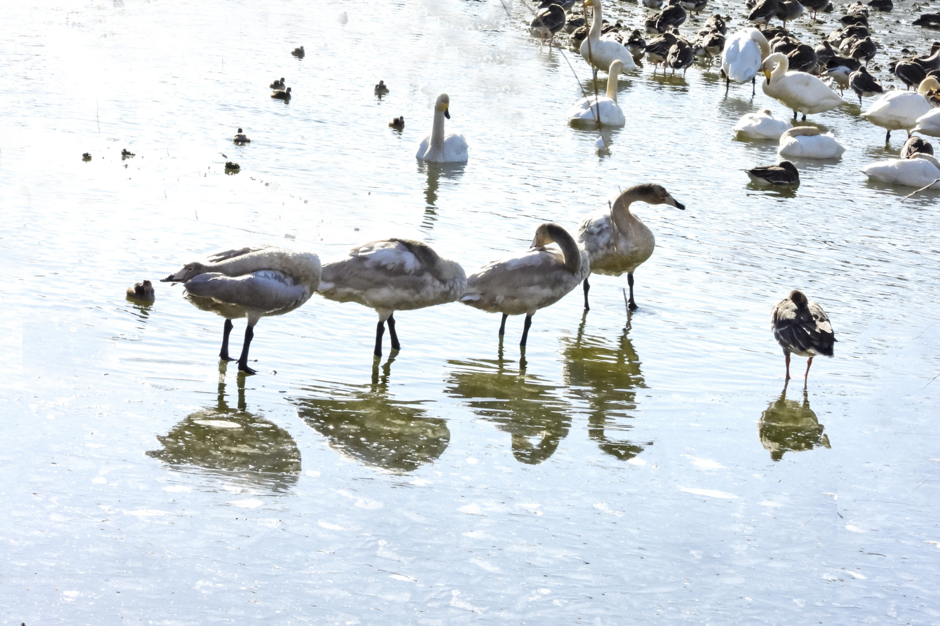 큰고니 4마리의  깃털 색깔이 흰색이 아님