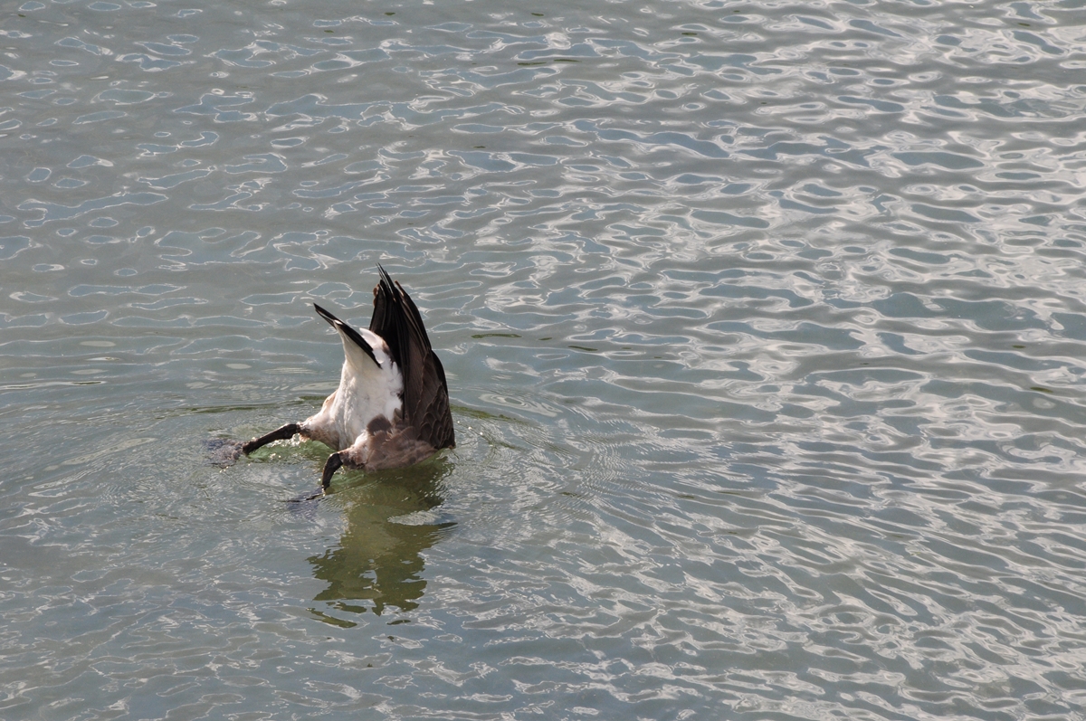 야생 오리의 제자리 곤두박질로 하얀희프를 하늘로 노출했다.