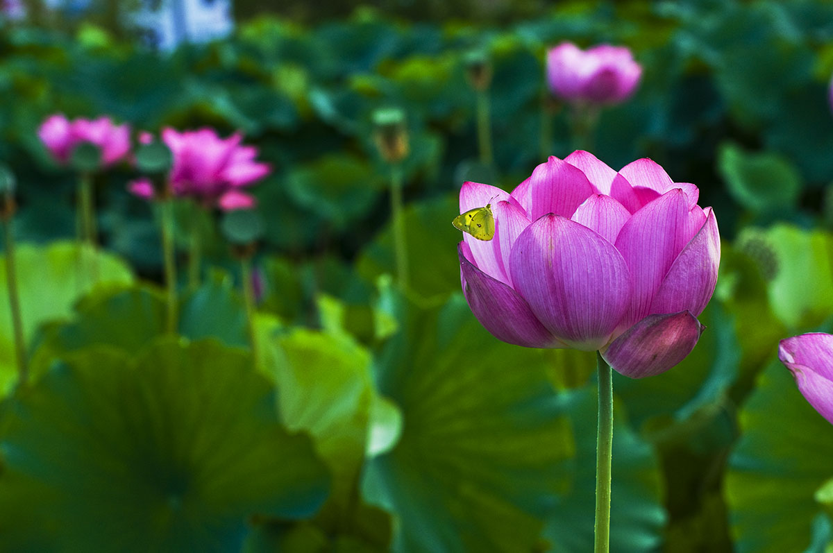 연꽃 위에 노랑나비 한마리가 살포시 내려앉았습니다.