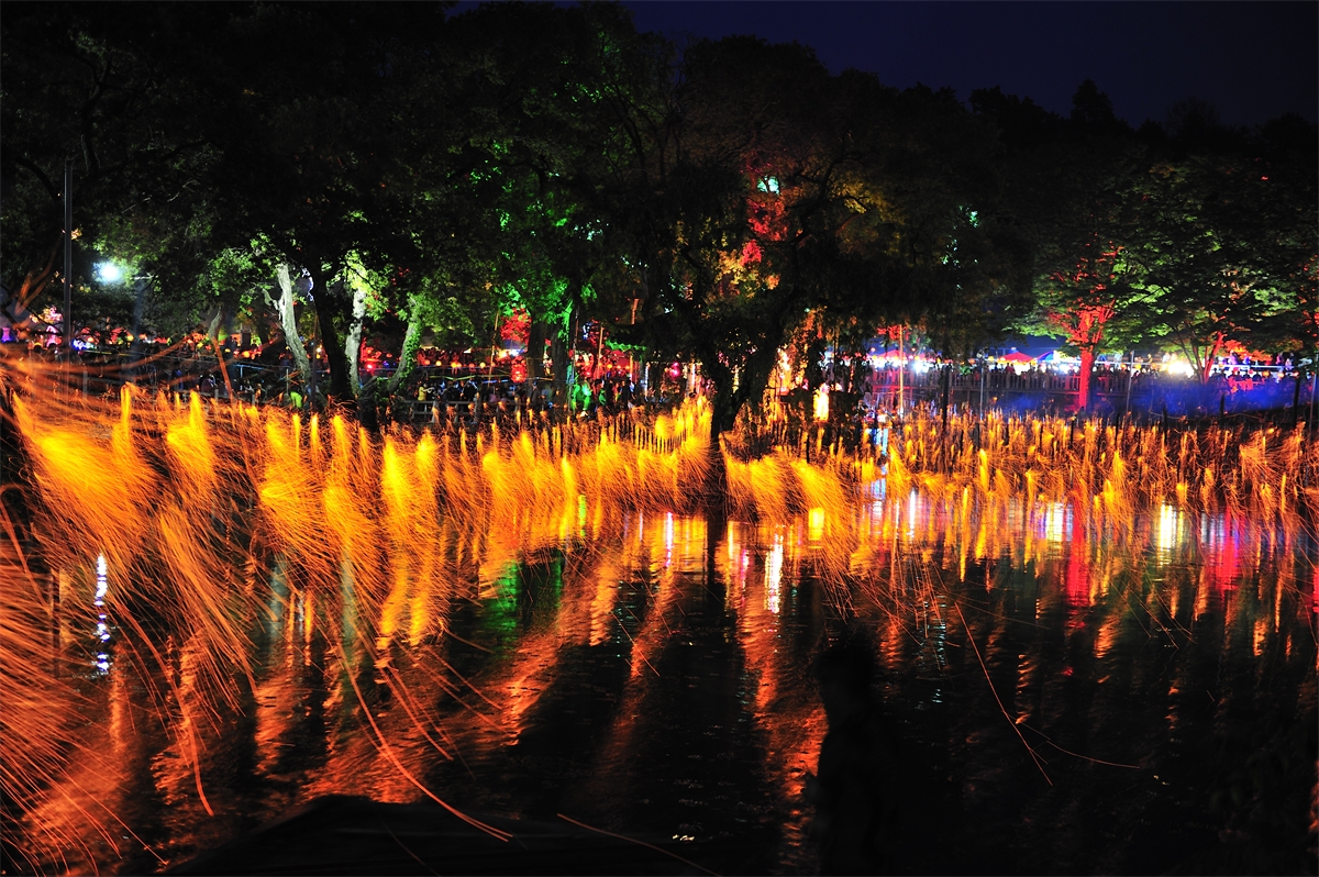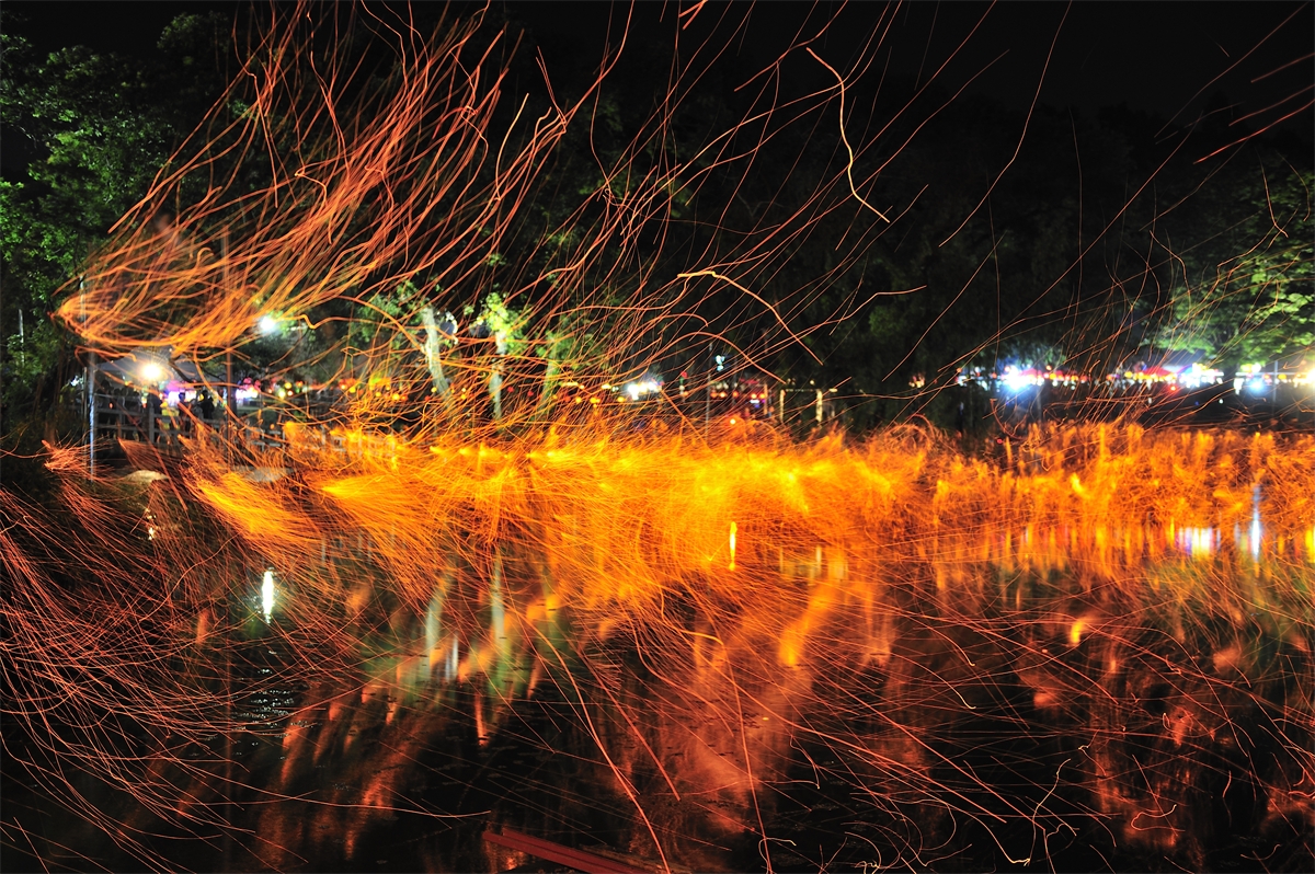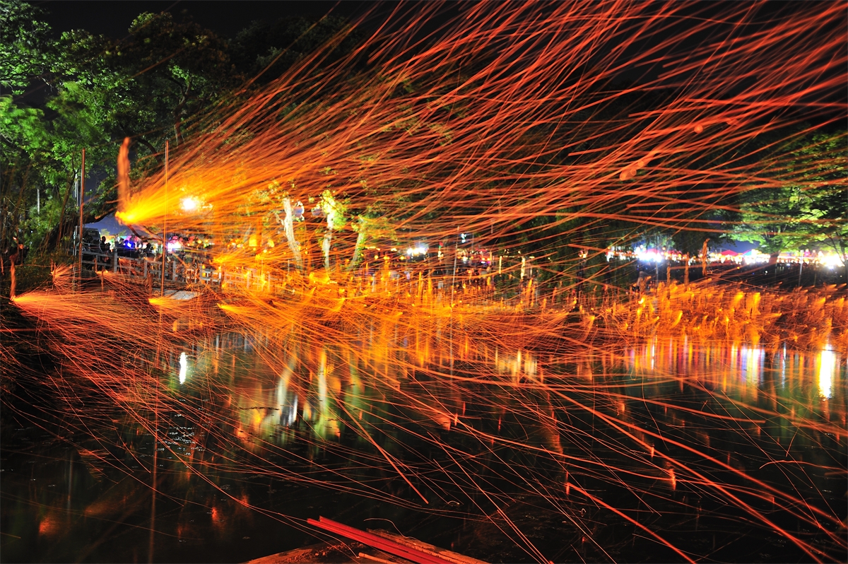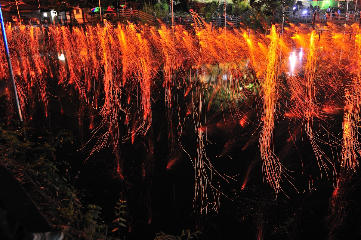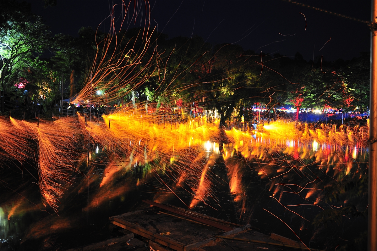 옛부터 내려오던 방식으로 밤불꽃놀이를 재현하는