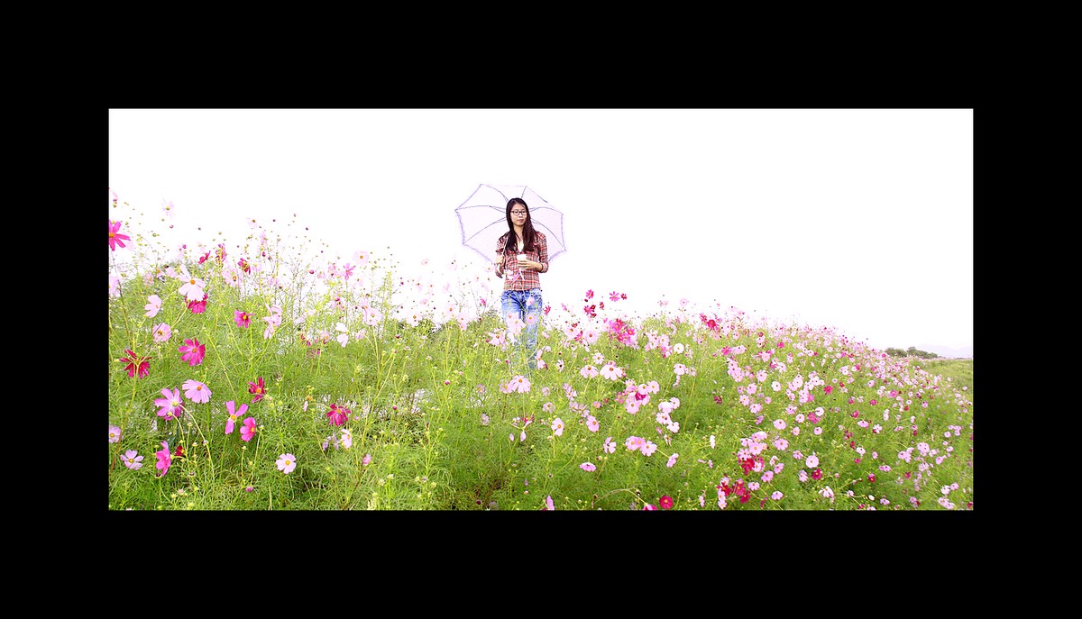 황금벌판을 마주하고 코스모스 꽃 길을 걸어보는