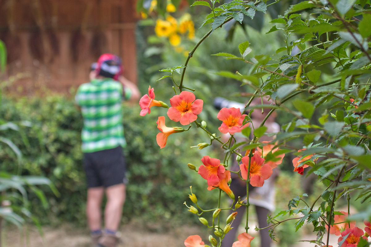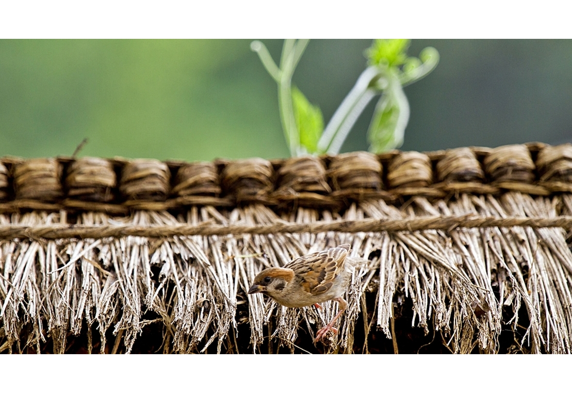 능소화 뒷편 처마밑에 참새가 먹이를 쫓는장면 촬영중.
