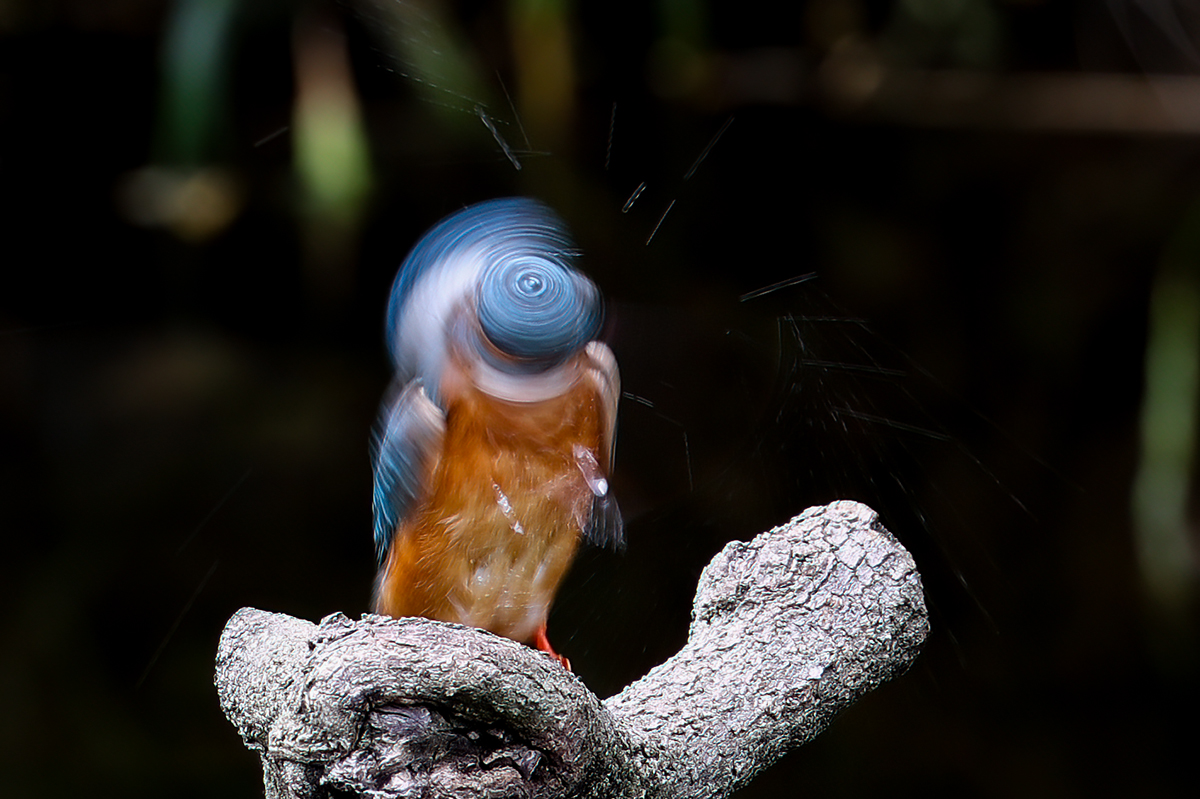 물총새가 먹이를 잡으러 물속으로 다이빙하여 등어가서 먹이 잡기를 실패하고 올라와서는 재충전하면서 깃털에 묻은 물을 털어 내기 위하야 온몸을 뒤틀어 휘둘리며 털어버리는 순간