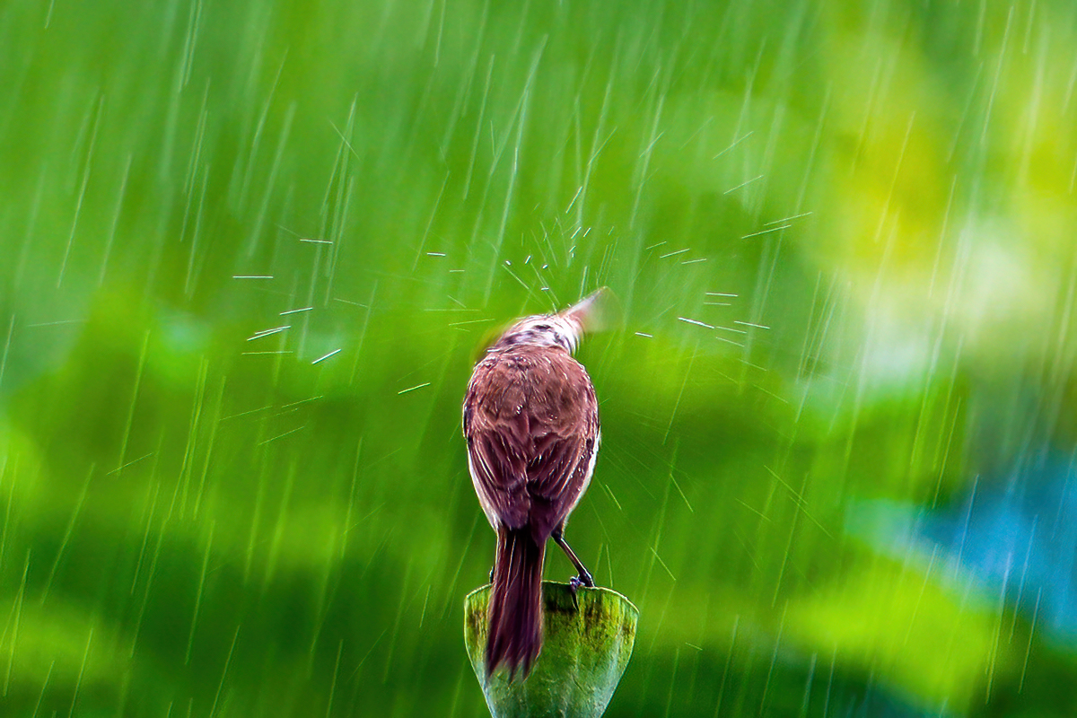 장대같은 비가 내리는 연밥 위에 앉은 개개비가. 깃에 묻은 물을 털어 내기 위해 머리를 좌우로 재빠르게 돌리면 머리에 묻은 물이 튕겨져 나가는 순간