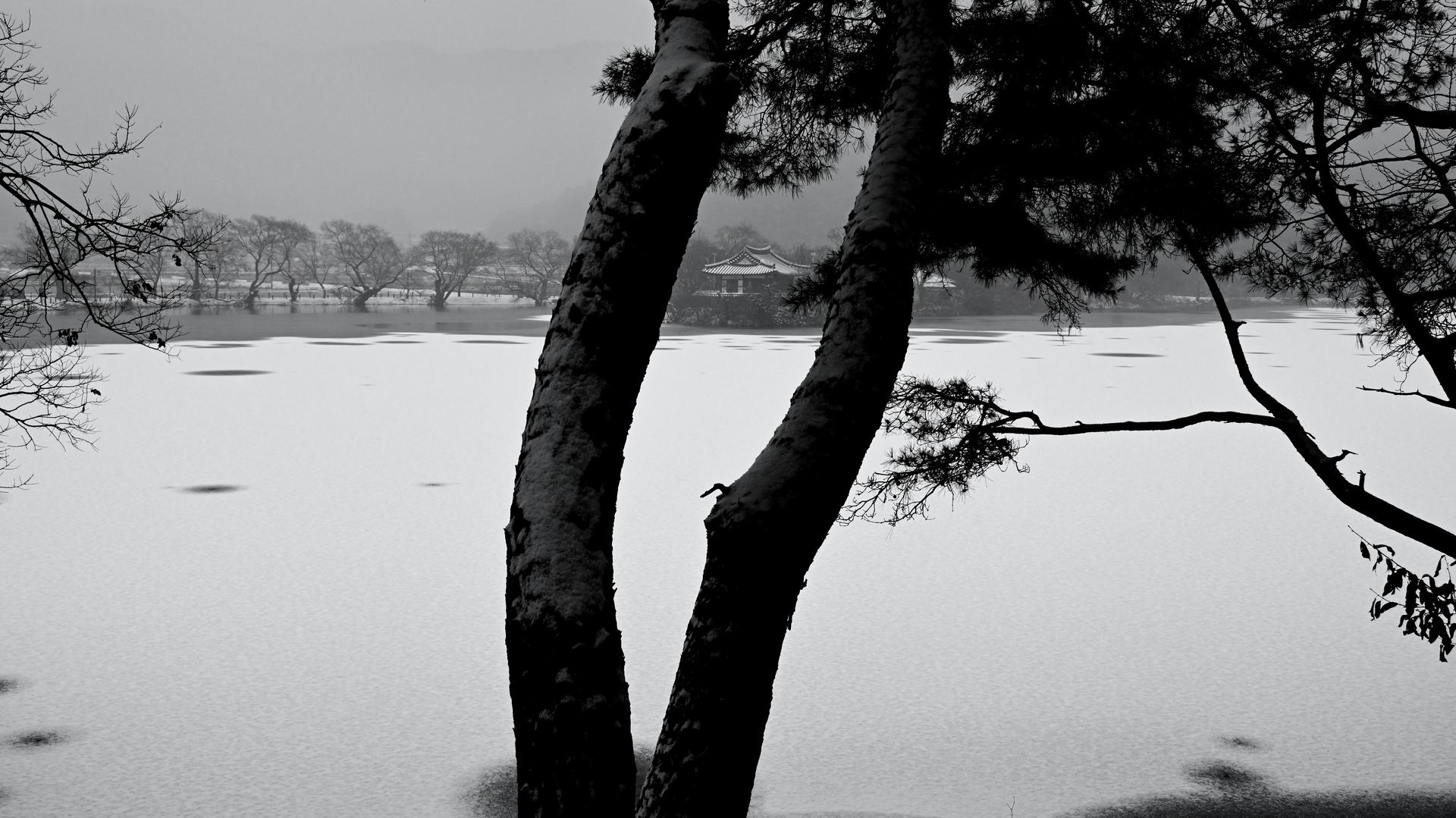 하얗게 내린 위양지의 겨울을 소나무를 부각시켜 엮어본 작품입니다