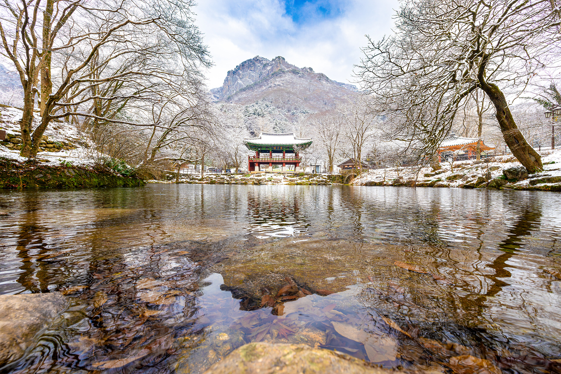 장성 백암산 백양사 쌍계루에 눈내리는 날