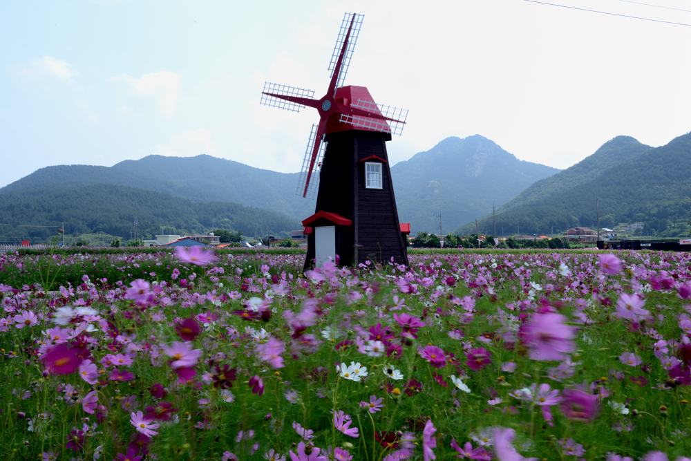 거제 둔덕 청마기념관 앞들에 때아닌 코스모스로