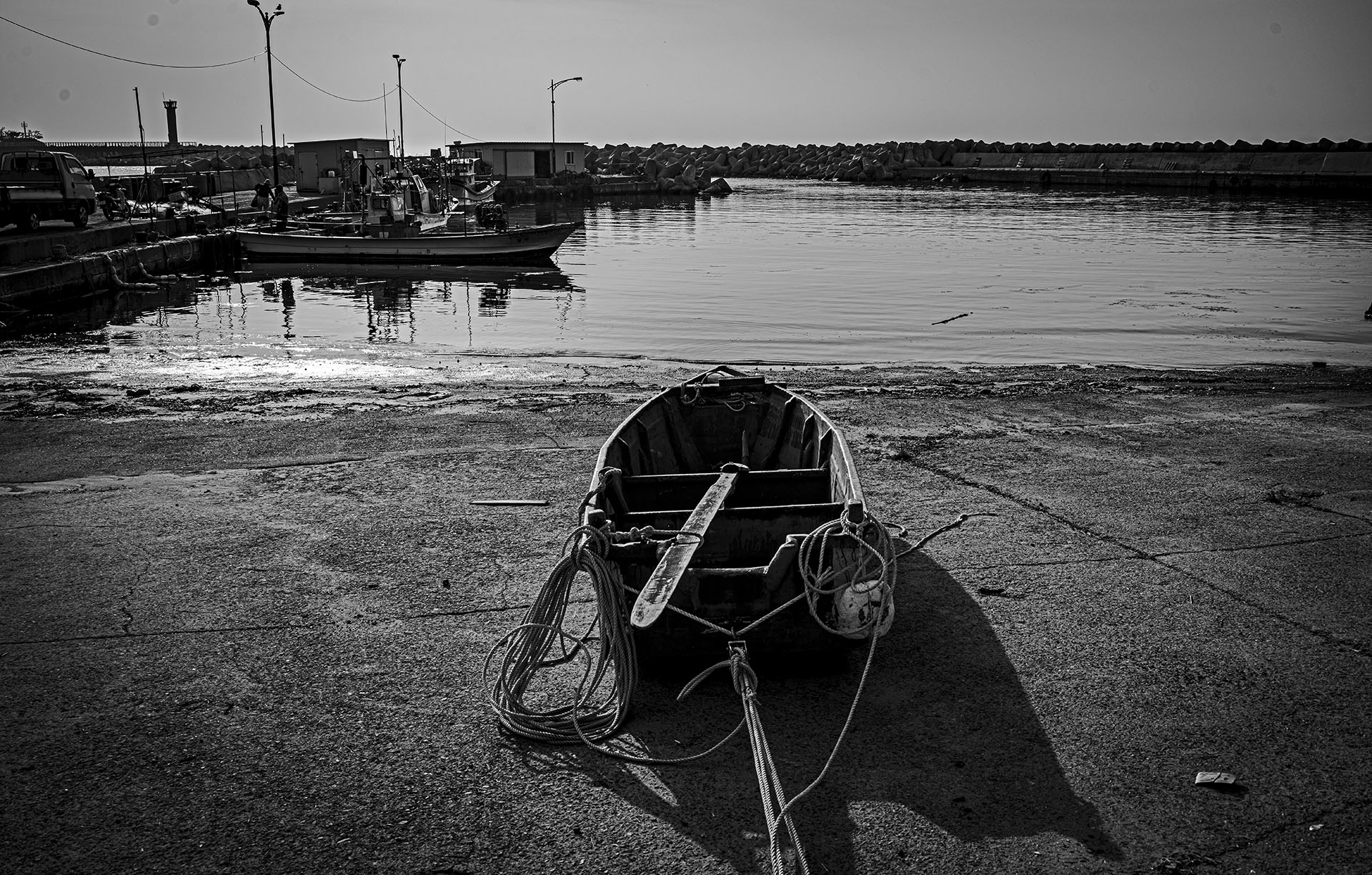 바닷가 조그마한 항구에 쉬고있는 작은 배를 보았습니다