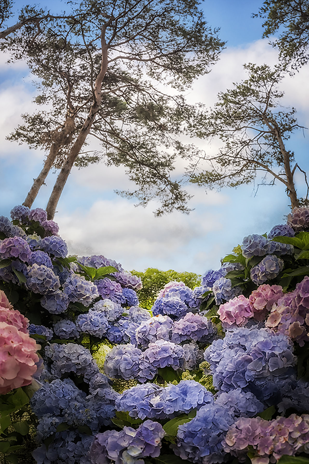 수국과 소나무가 함께 어우려져 있는 숲입니다