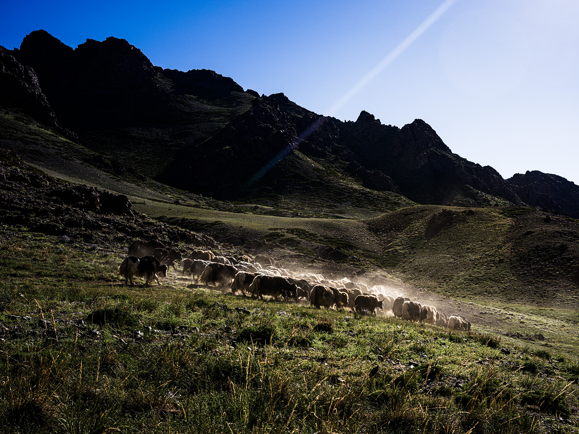 계곡 속의 야크들이 물이 있는 곳으로 이동 중