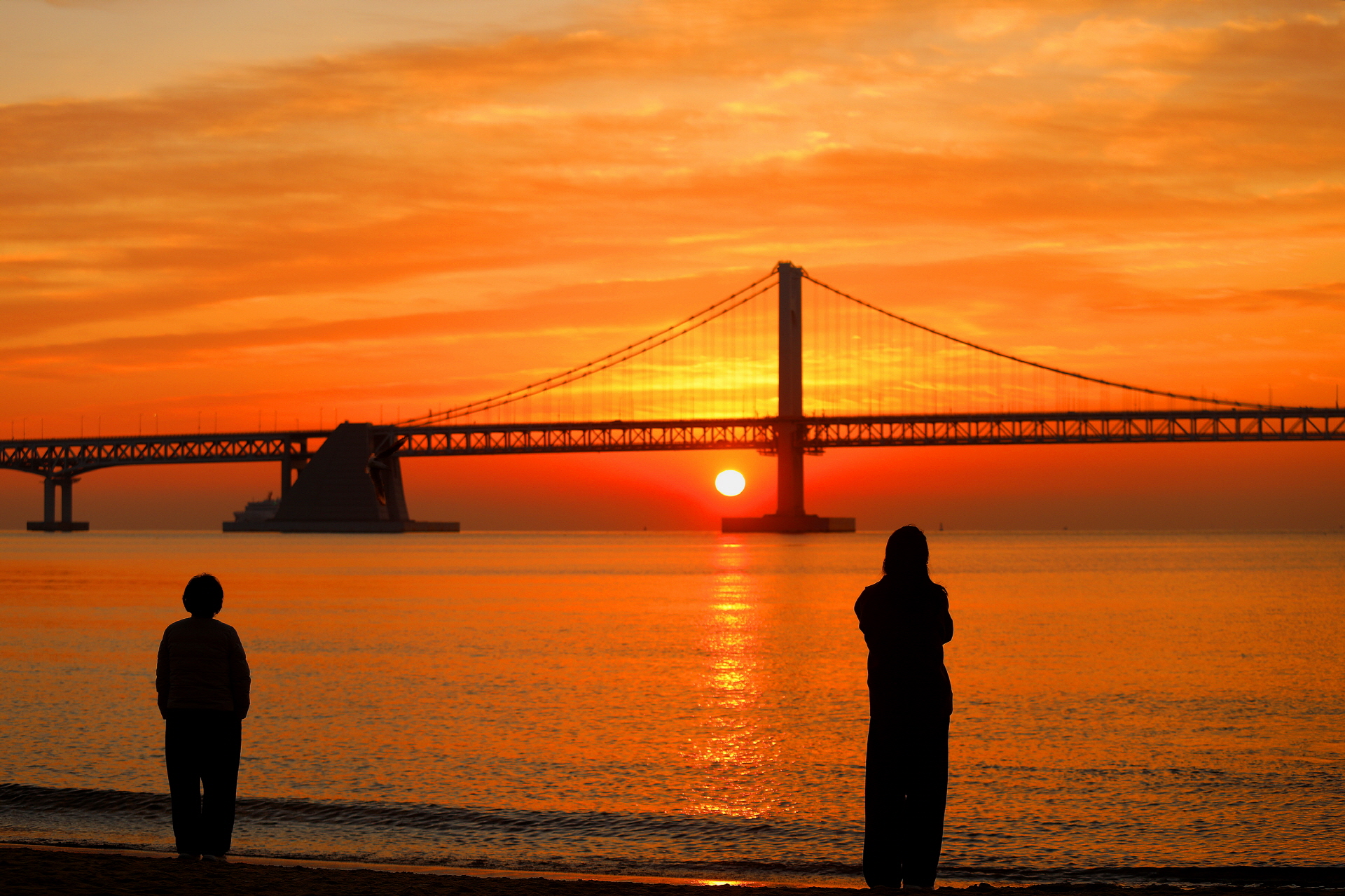 부산 광안대교에서 떠오르는 일출을 바라보면서 무슨 소원을 비는중일까요