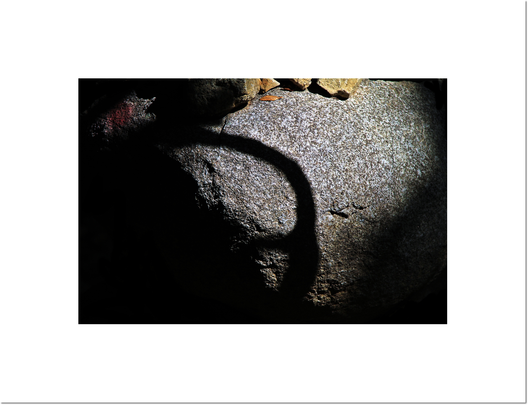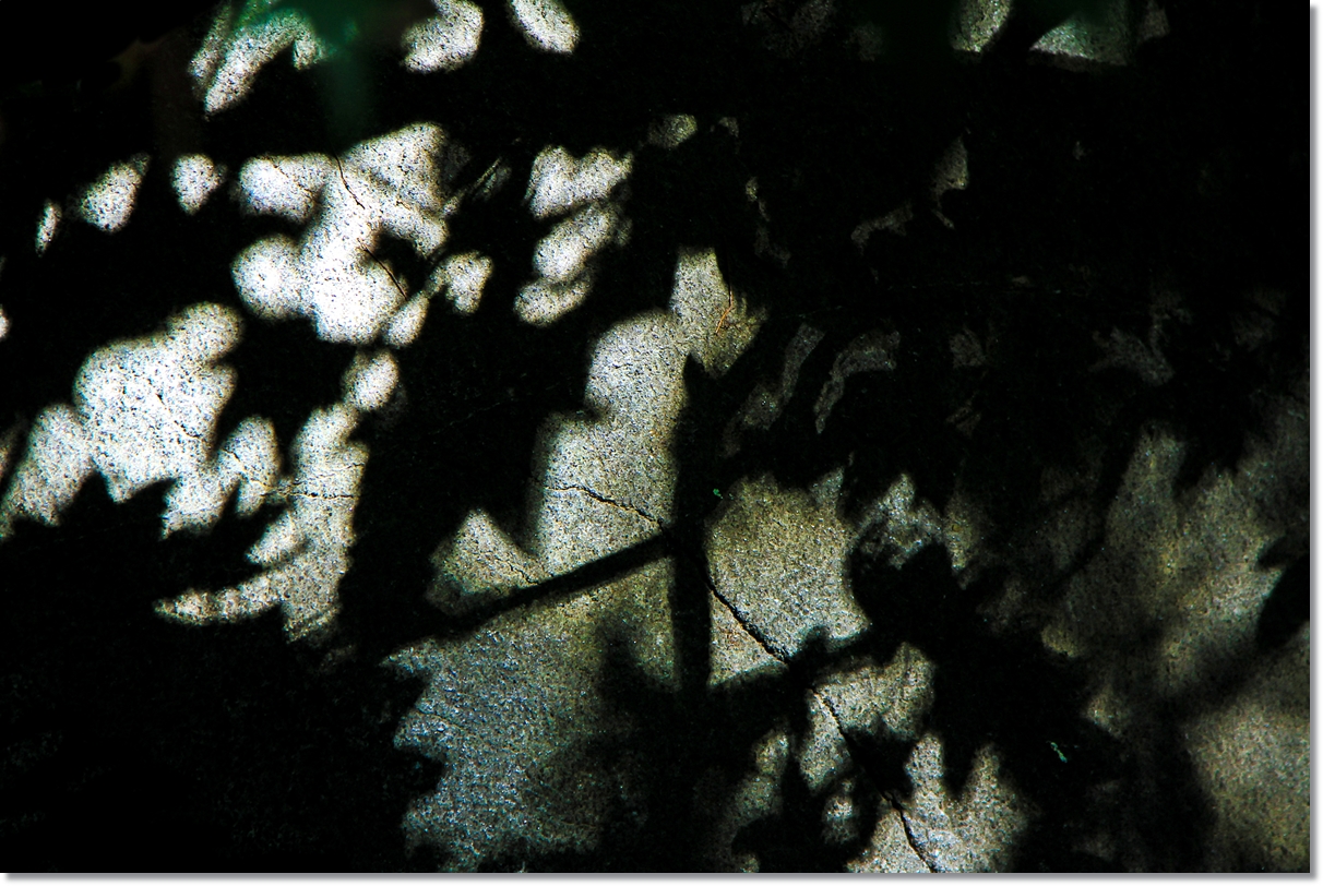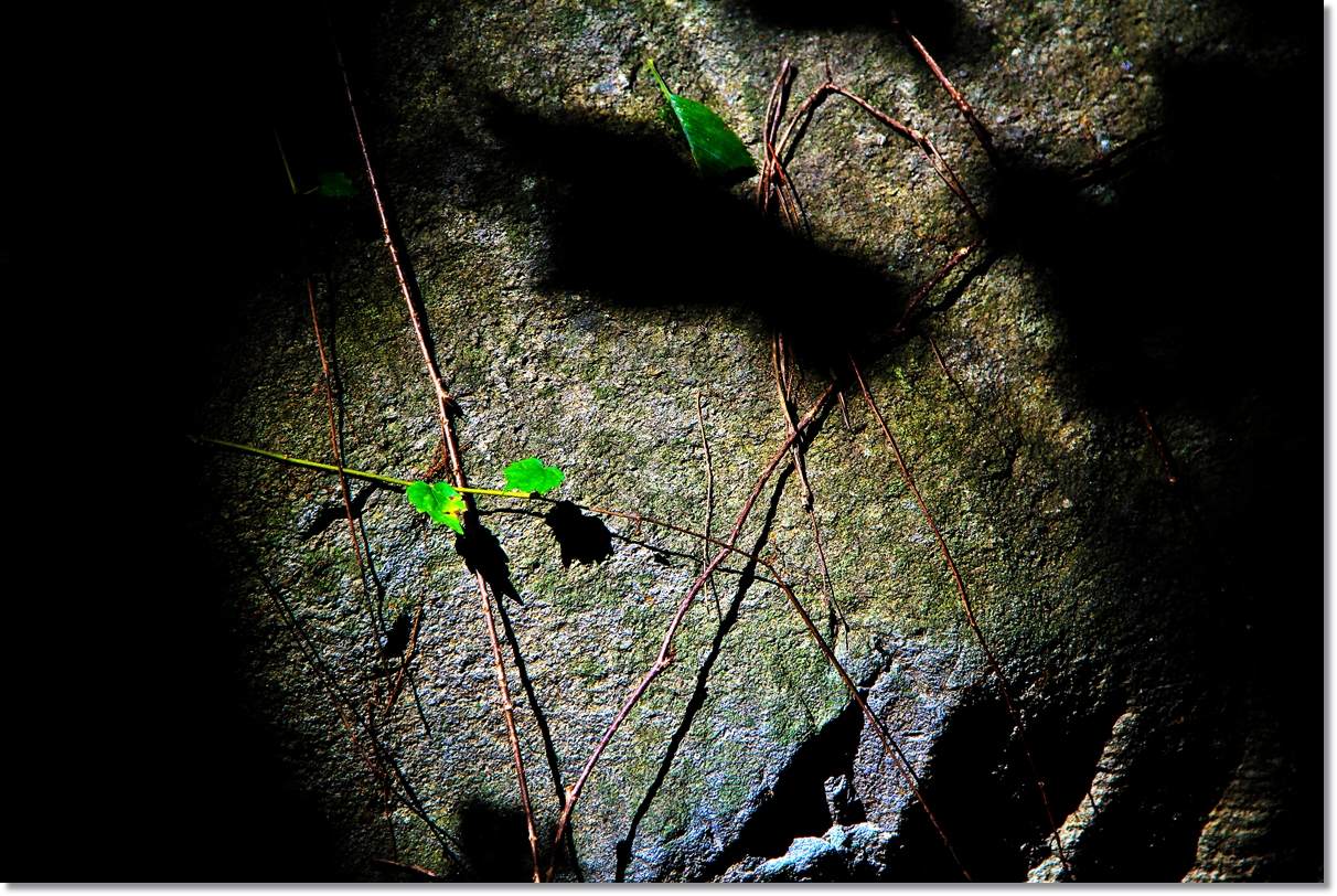 숲속의 돌탑 과 바위에 새겨진 빛 과 그림자.