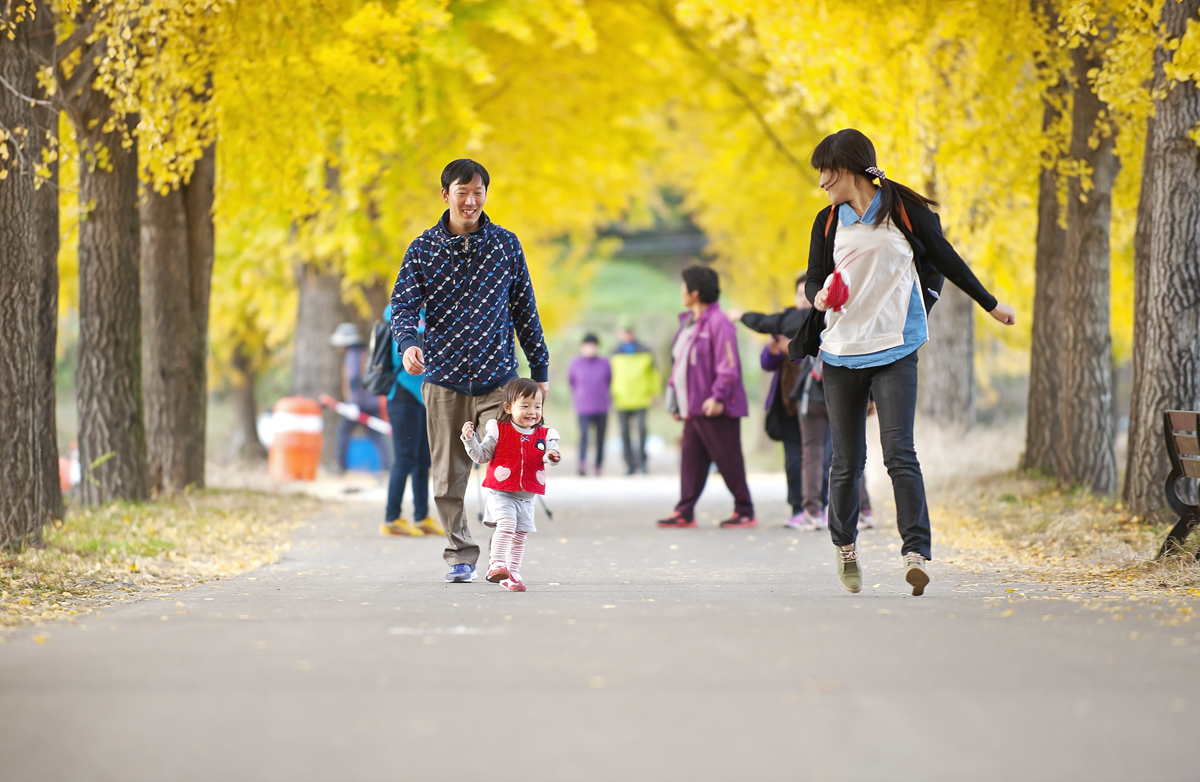 노란 은행잎이 가득한 곳에서의 행복한 시간을 보내는 가족의
