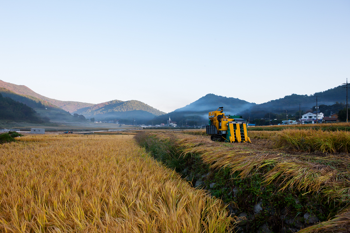 이른 아침 마을 어귀로 낮은 안개가 낮게 드리우고.....