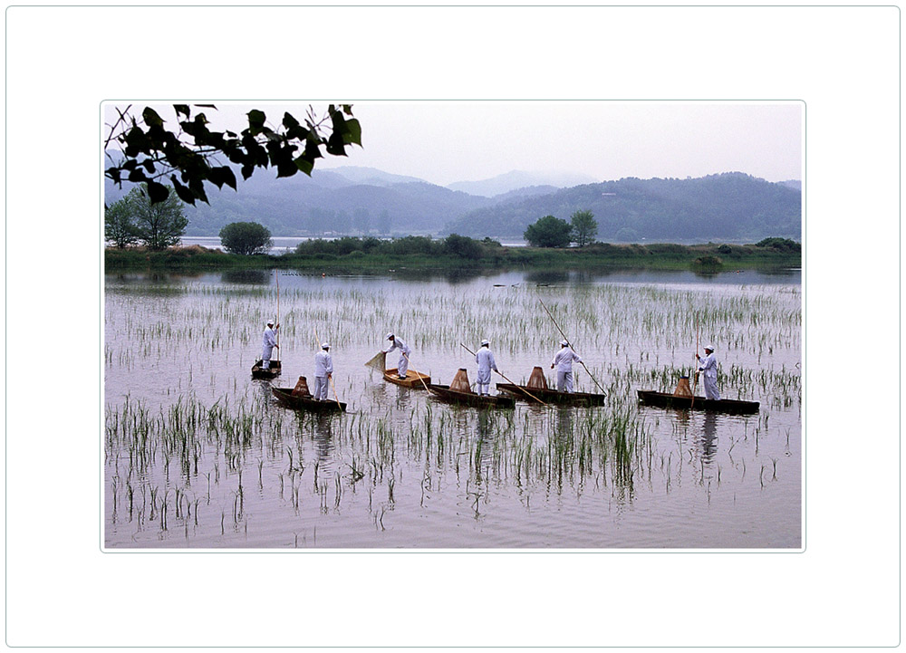 전통 물고기잡이를 재현하고 있는 어부들..