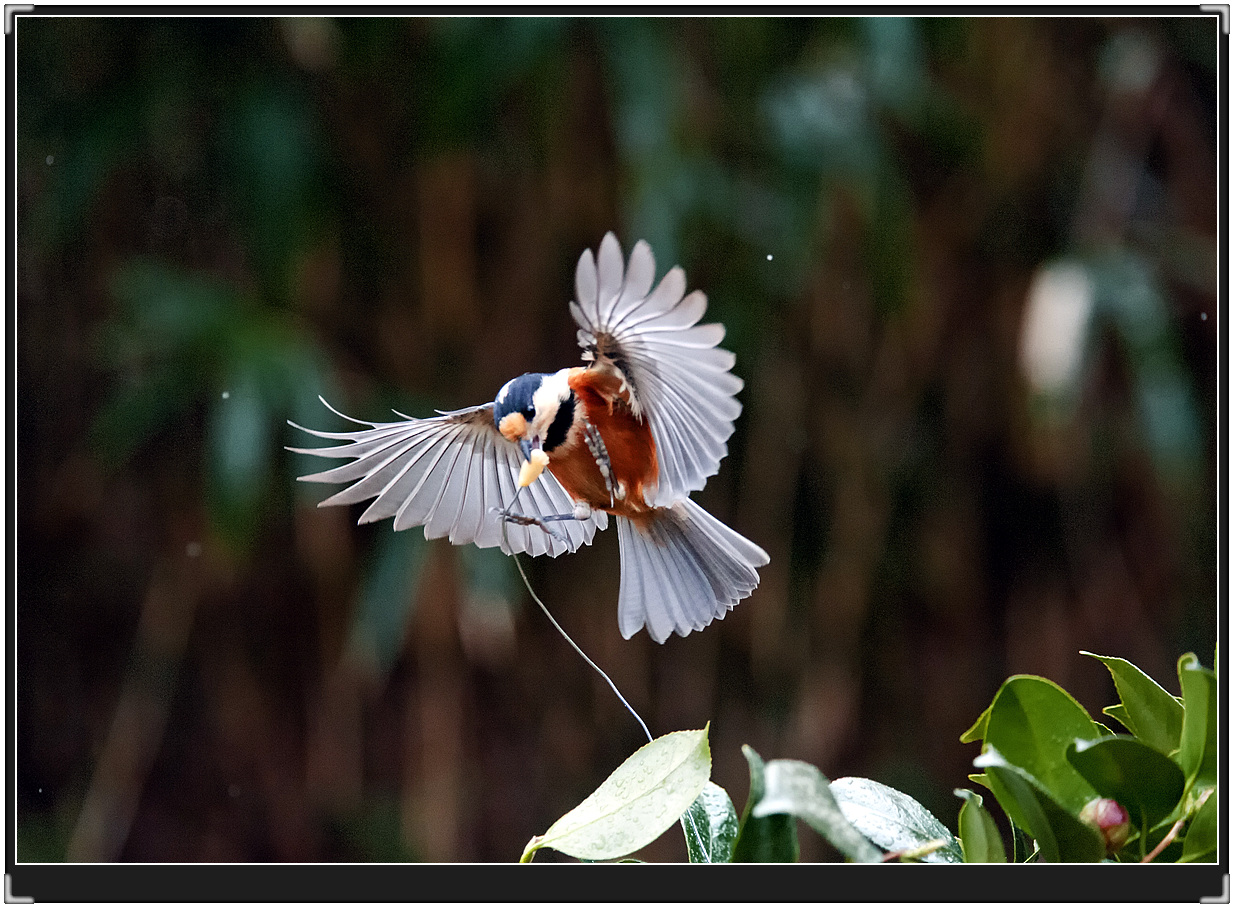 범어사 눈이 오는데 새들이 잣에 미쳐 날아 오네요