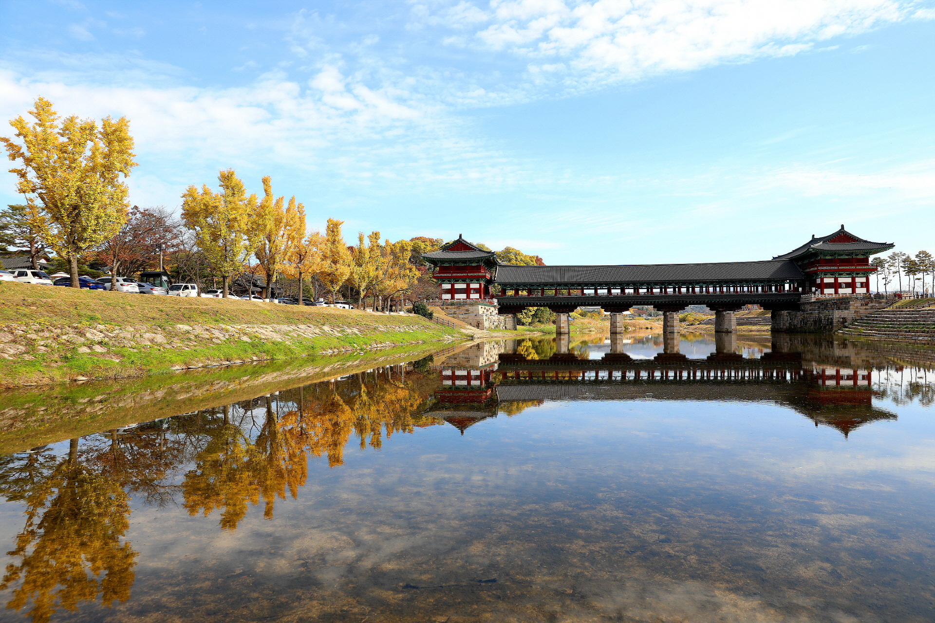 가을 월정교와 은행나무 반영이 아름다웠던날