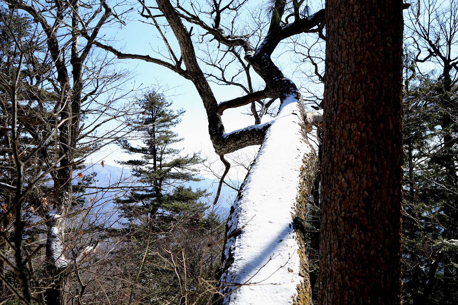 누워 있는 나무에 눈이 살포시 내려 앉아 있다