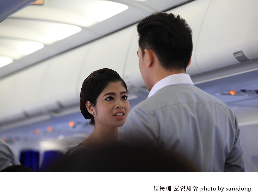 캄보디아 프놈펜에서 씨엠립 가는 캄보디아 국내선항공기 에서 승무원의 표정을 담아 보았다 여기에도 앙코르의 미소는 살아있었다