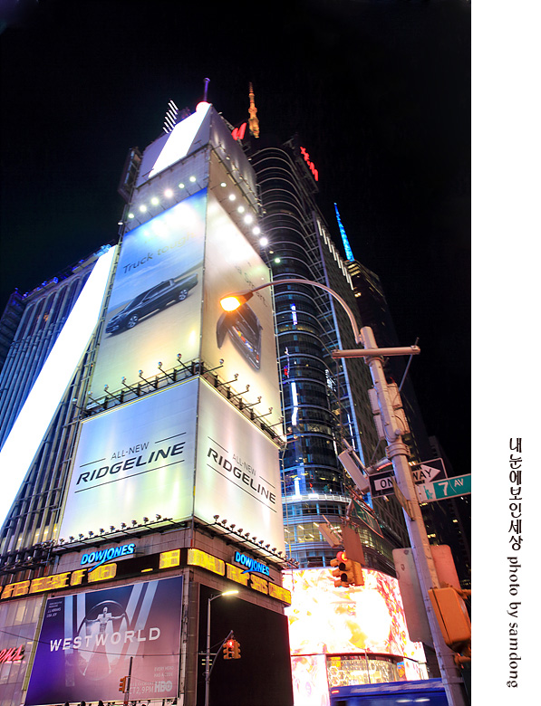 42번 스트리트(42nd Street)와 7번가(7th Avenue) 그리고 브로드웨이가 만나는 삼각지대를 일컬어 타임스 스퀘어라고 한다. 높은 빌딩과 화려한 네온사인 그리고 살아 움직일 것 같은 고해상도의 모션 광고들이 가득한 뉴욕에서 관광객들의 카메라 스포트라이트를 가장 많이 받는 곳이다.<펌> manhattan NEWYORK U.S.A.