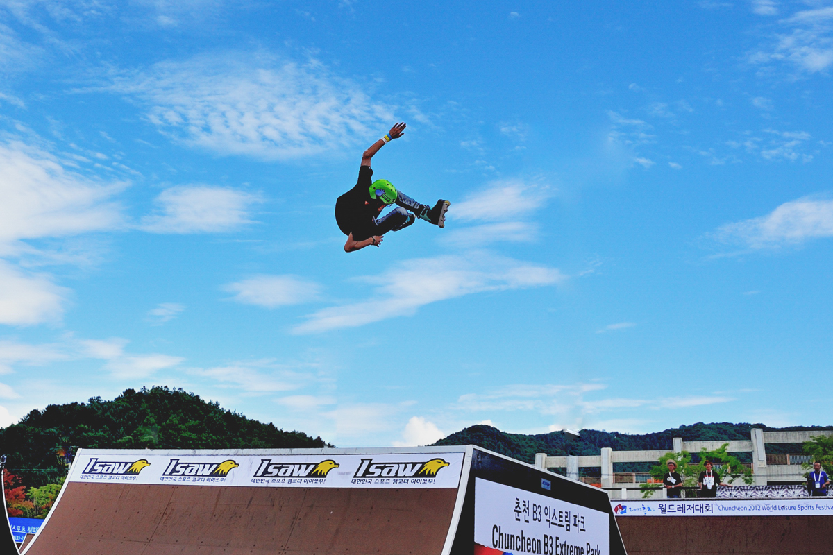 2012 춘천월드레저컵 국제 액션스포츠 팸피언십 에서 인라인슬라럼 고공점프하는장면