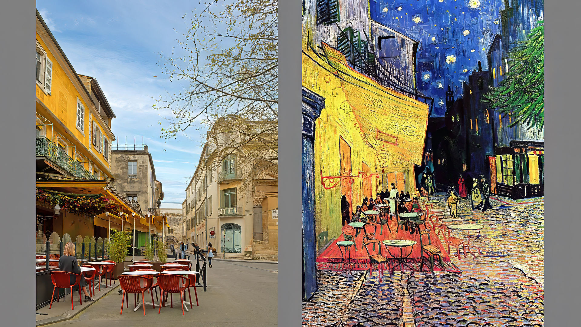우측은 고흐의 대표작 중의 하나인 "밤의 카페 테라스 (cafe Terrace Place du Forum)"