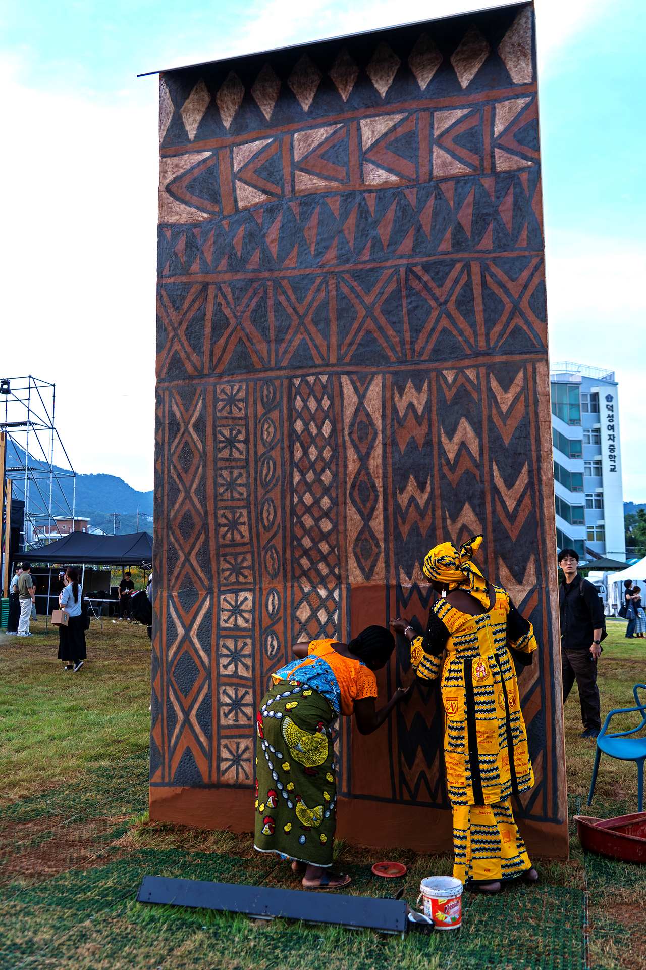 부르키파소(서아프리카)의 작가 바포상 알렘푸아와 아세타 이도고가 티에벨레 전통벽화를 건축벽에 그리고 있습니다.