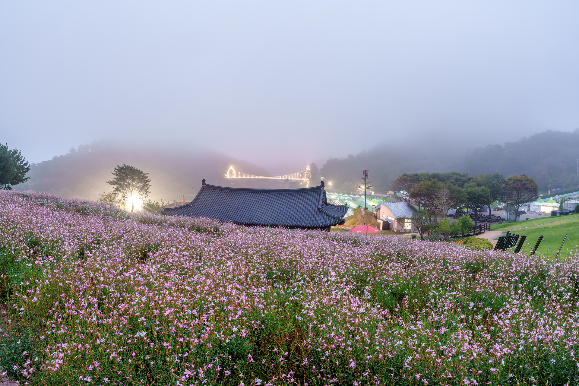 정읍구절초지방정원의 안개낀 새벽에 출렁다리에 야경빛이..