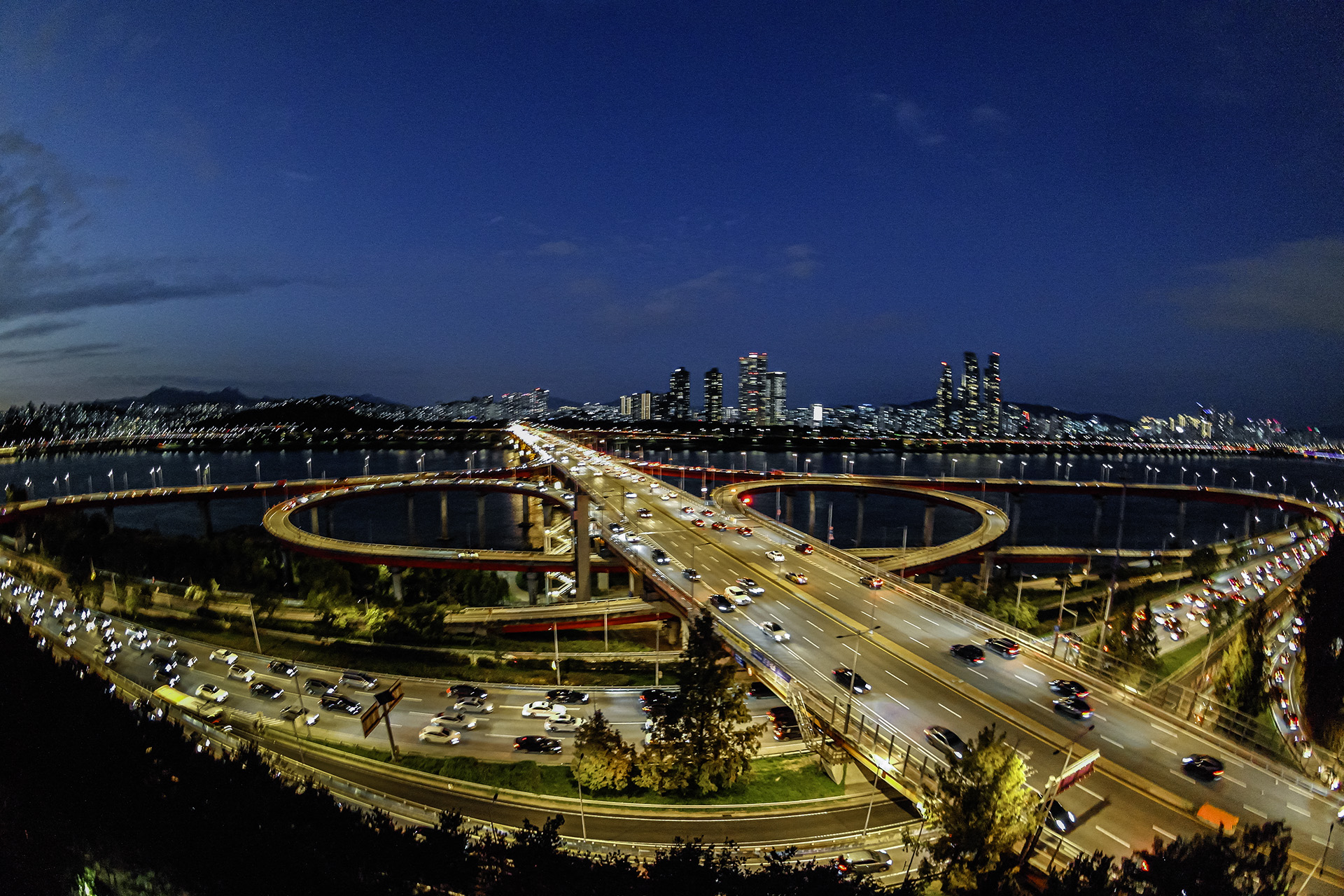 수많은 자동차들이 다리와 교차로를 지나가는 모습이 장관이다