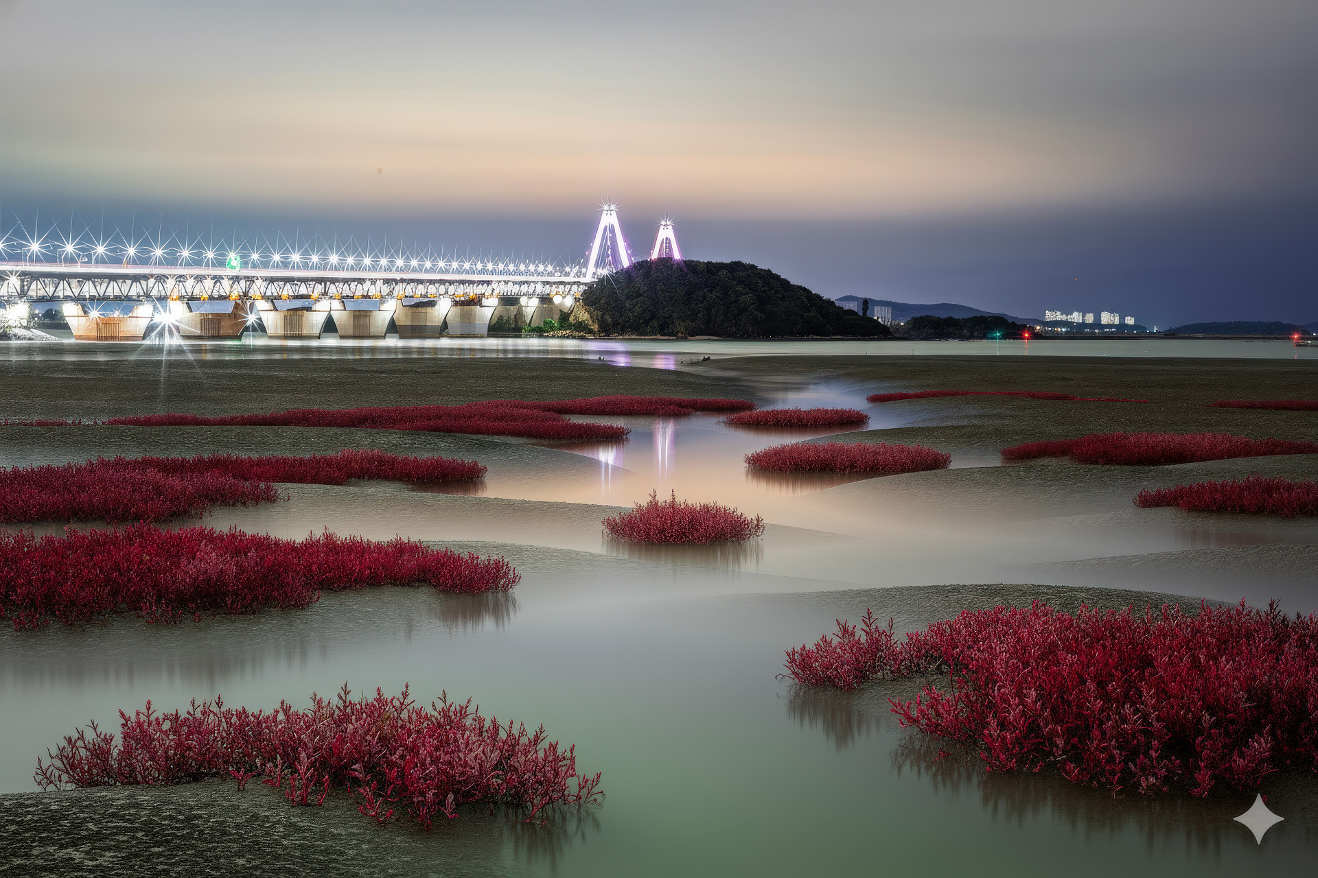 구글 나노바나나(Google Nano Banana를 이용,정서진의 야갼갯골장노출을 칠면초가있는 야갼갯골장노출로 변환한 것임.