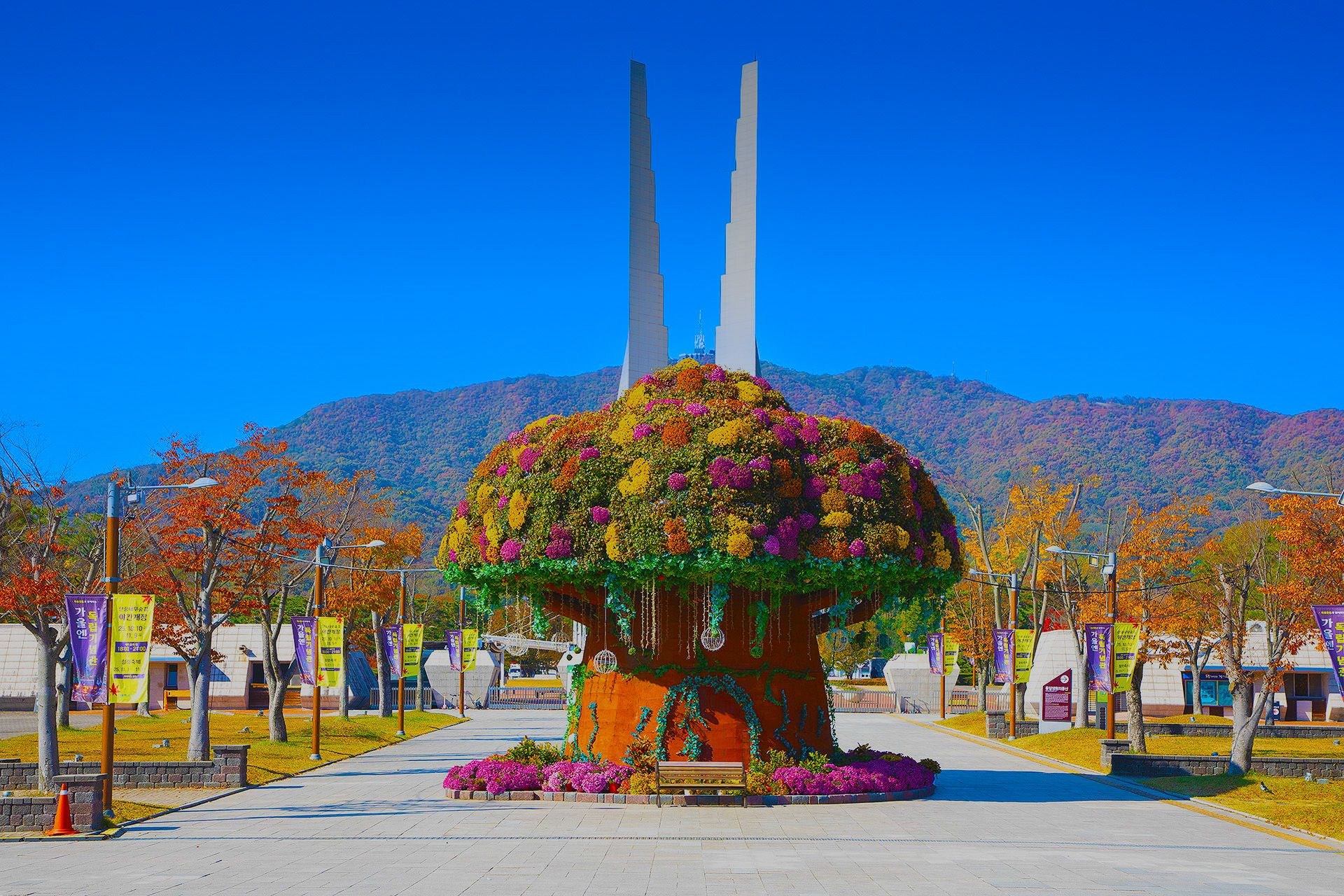 수많은 국화로 장식하여 추모하고
