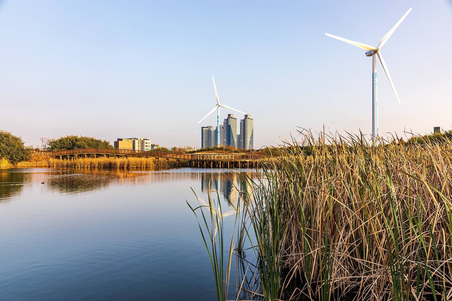 갈대가있는 호수가에서두대의풍차를본다