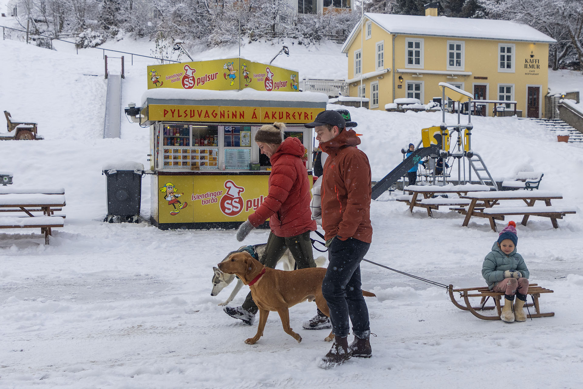 눈 내린 아이슬란드의 눈 썰매를 타고 즐거워하는 아이. .