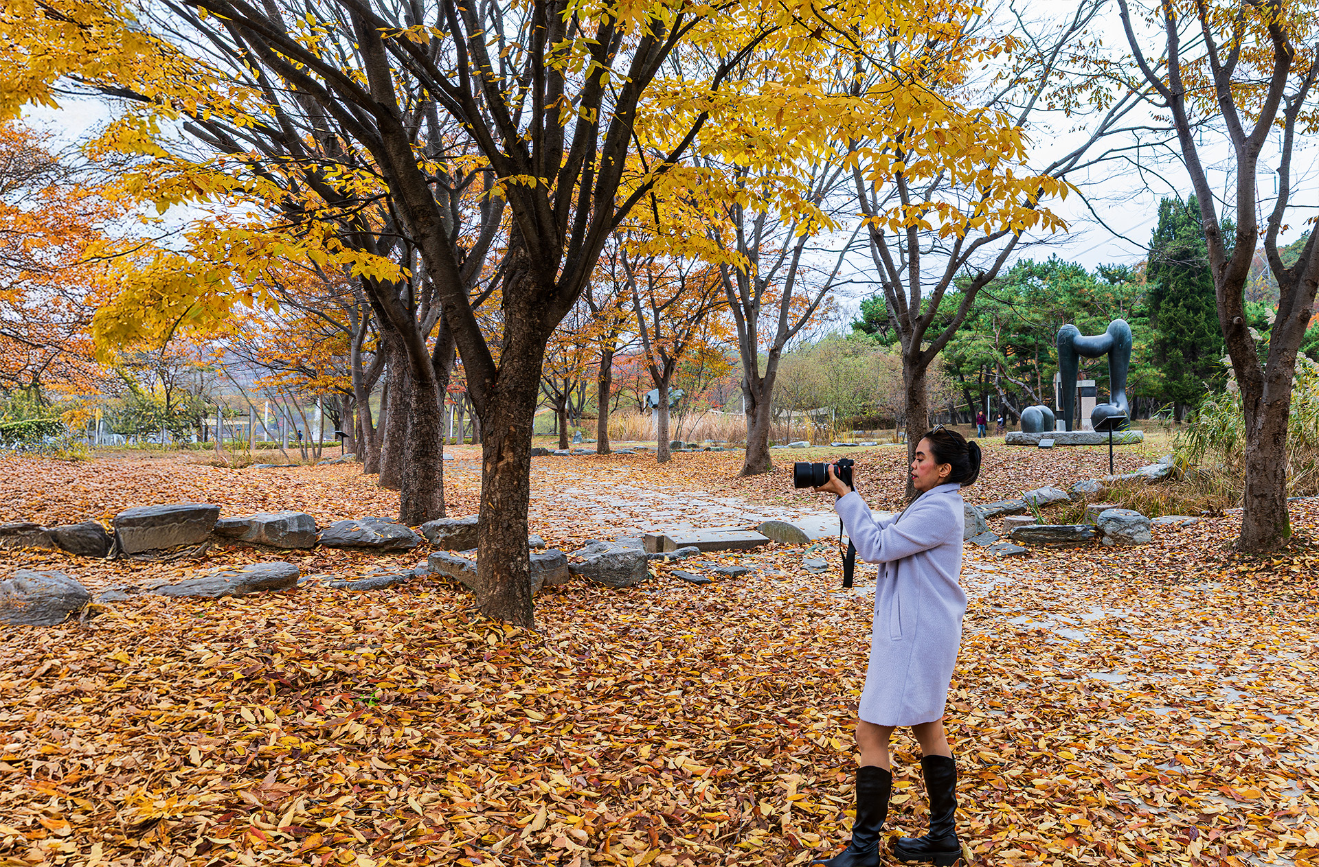아름다운가을단풍과 수북이쌓인낙엽을카메라에담는외국인여작가에 촬영포즈