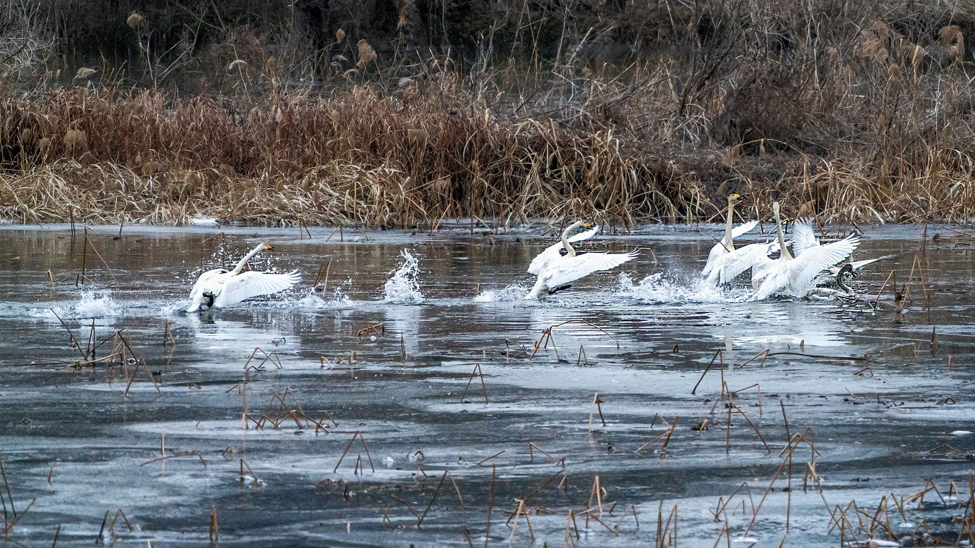 추운지방 멀리서 내려와 안도의 환희에 빠져있는 고니..