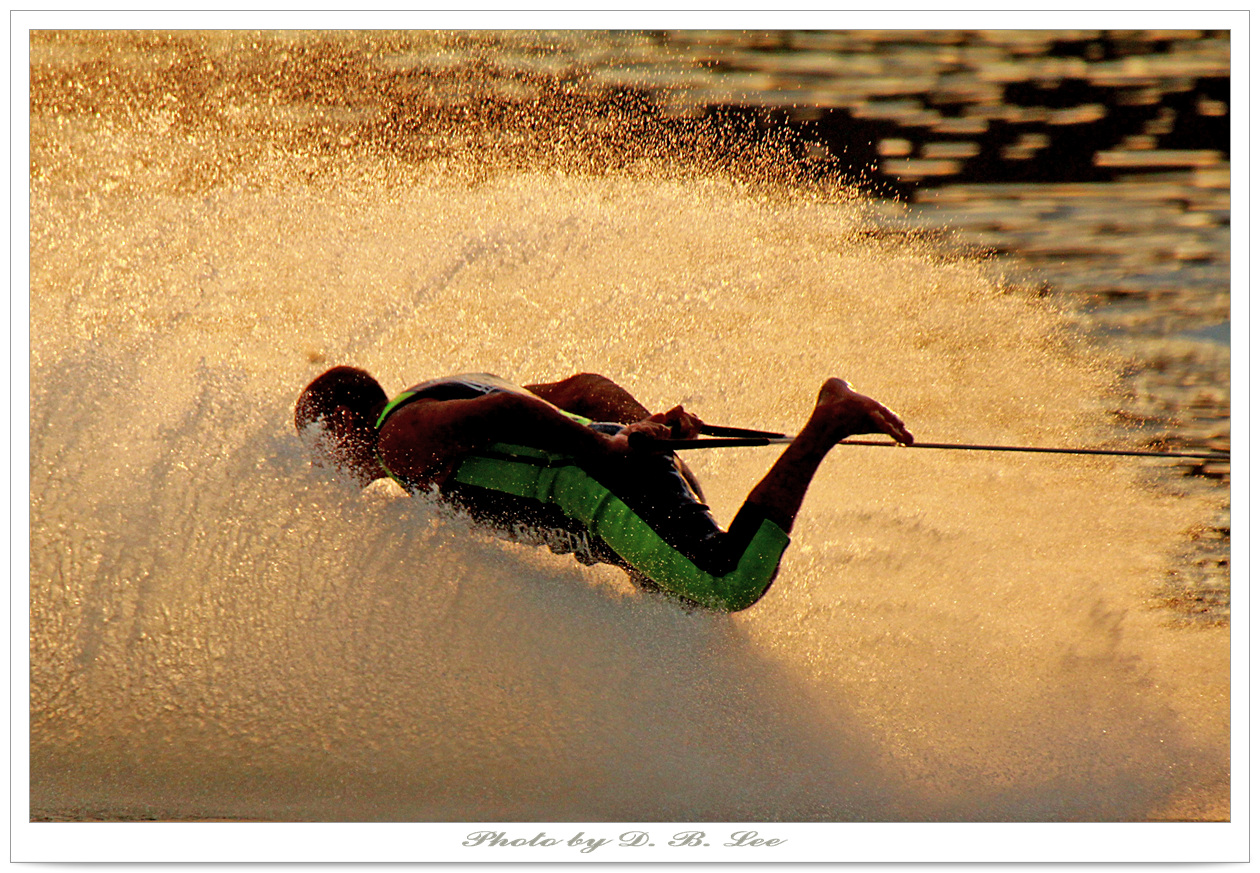 춘천 레저월드대회의 플로리다 수상스키쇼중 맨발로 뒤로 스키타기 묘기입니다.