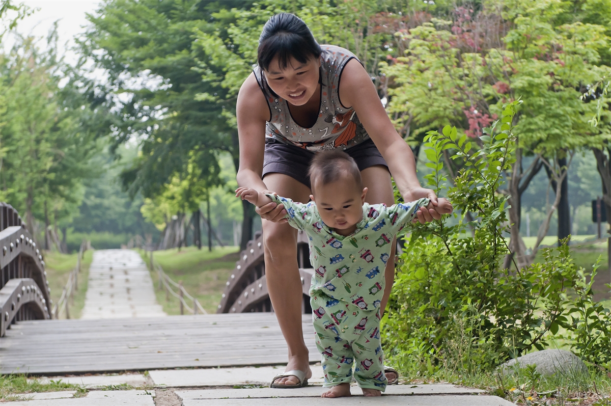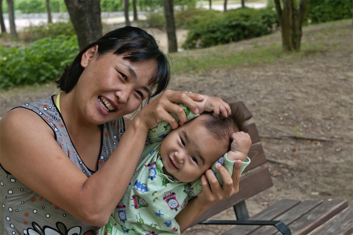몽골에서 시집온 아기엄마가 아침 산책으로 서울숲에서 아기와함께 즐거운 시간을 보내고 있다.