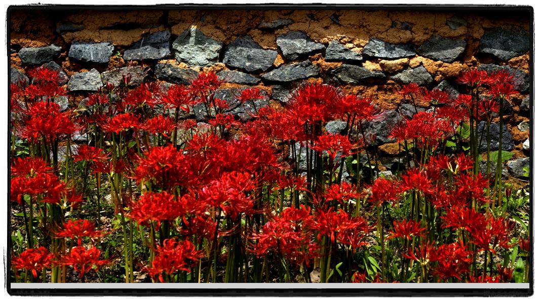 용천사 돌담 에 자리잡은 상사화